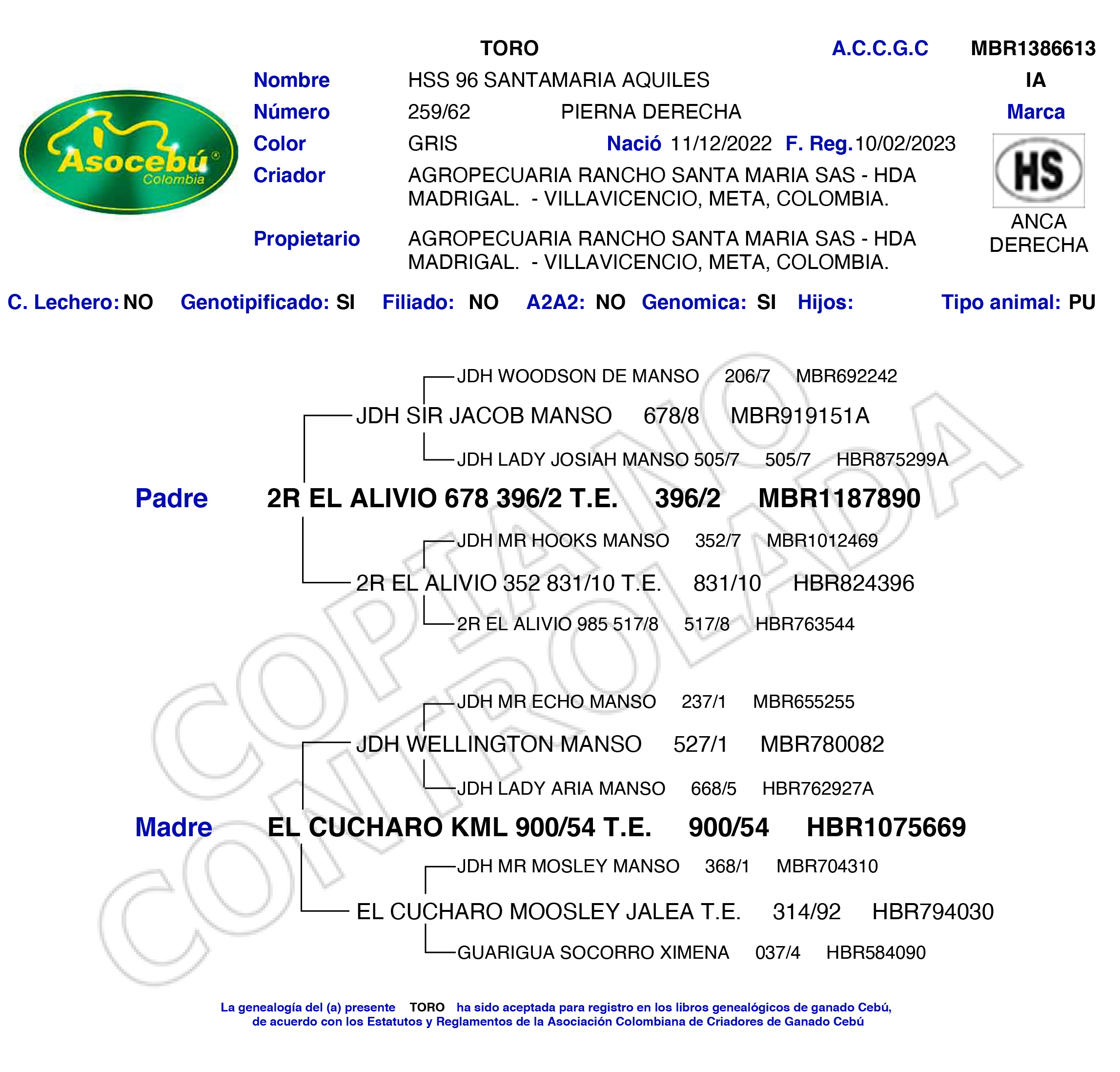PADRE: JDH MR BUBBA MANSO 350/2 TE MADRE: E.O.Z JDH LADY ABRA MANSO 540/2 ET. RAZA: BRAHMAN GRIS