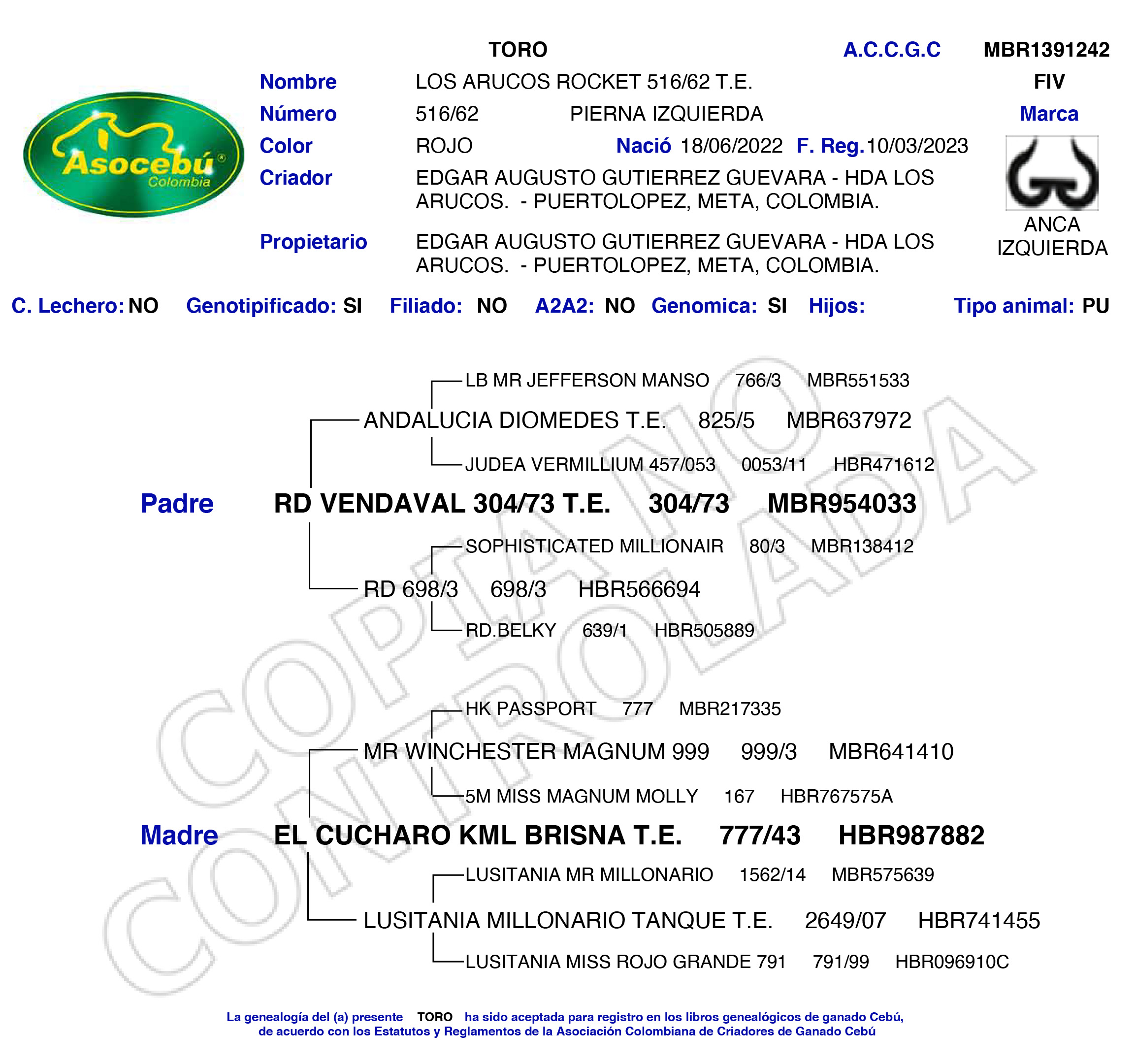 PADRE: RD VENDAVAL 304/73 T.E. MADRE: EL CUCHARO KML BRISNA T.E. 777/43 RAZA: BRAHMAN ROJO