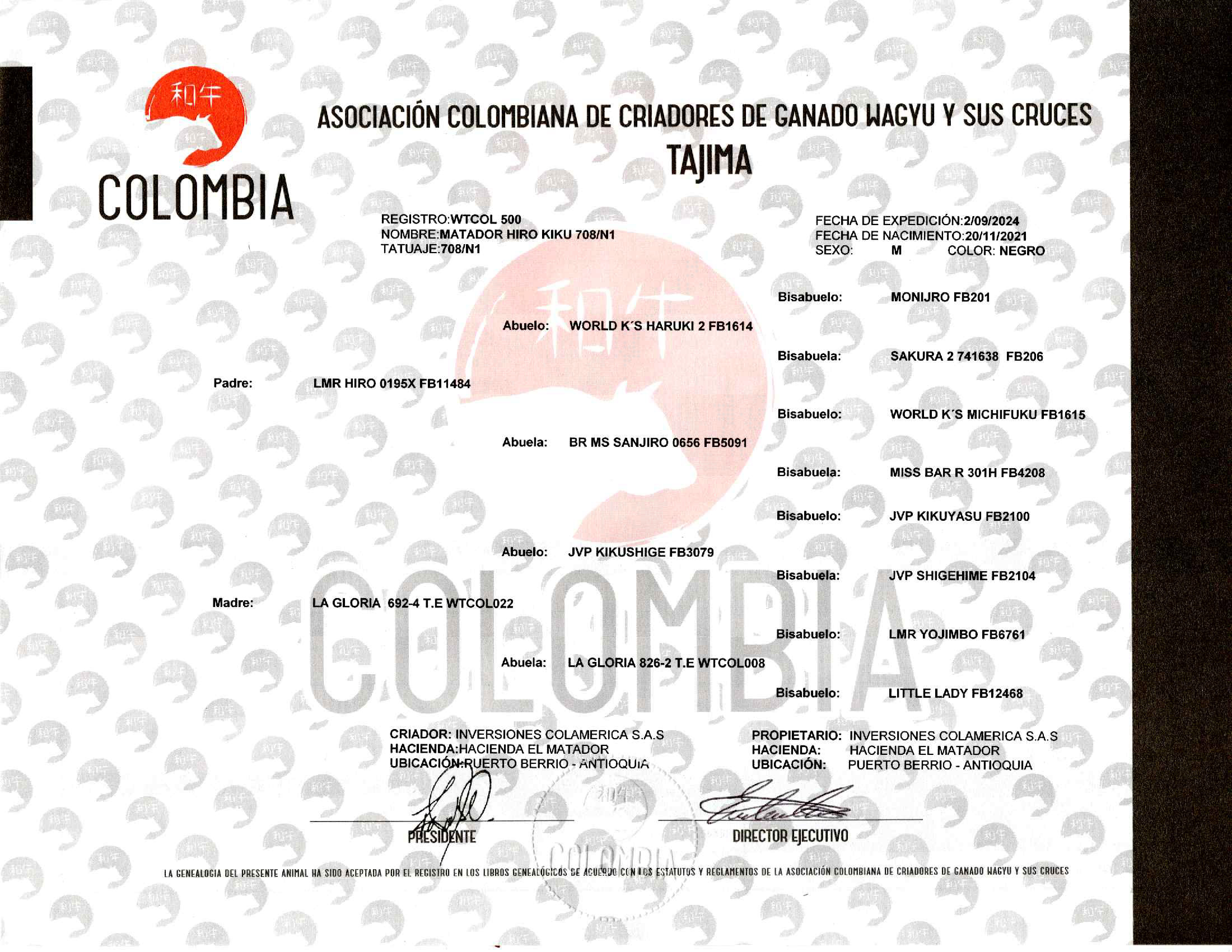 FECHA DE NACIMIENTO: 20/11/2021 NÚMERO: WTCOL500 TIPO: CARNE RAZA: WAGYU - AKAUSHI
