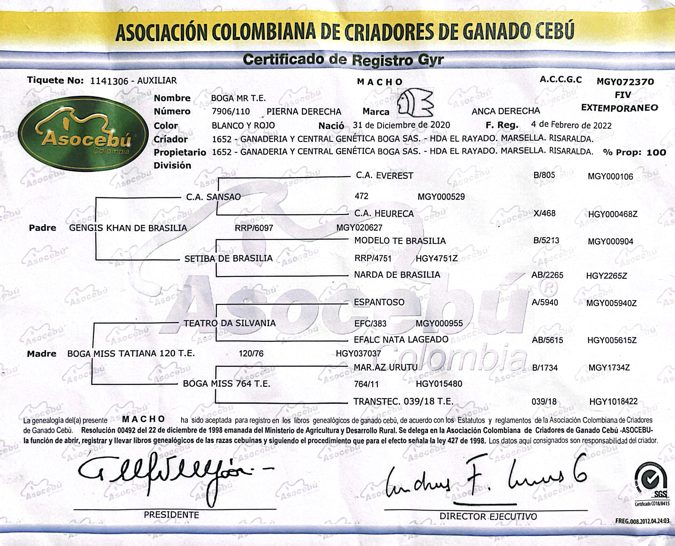 PADRE: GENGIS KHAN DE BRASILIA RRP/6097 MADRE: BOGA MISS TATIANA 120 T.E.E RAZA: GYR