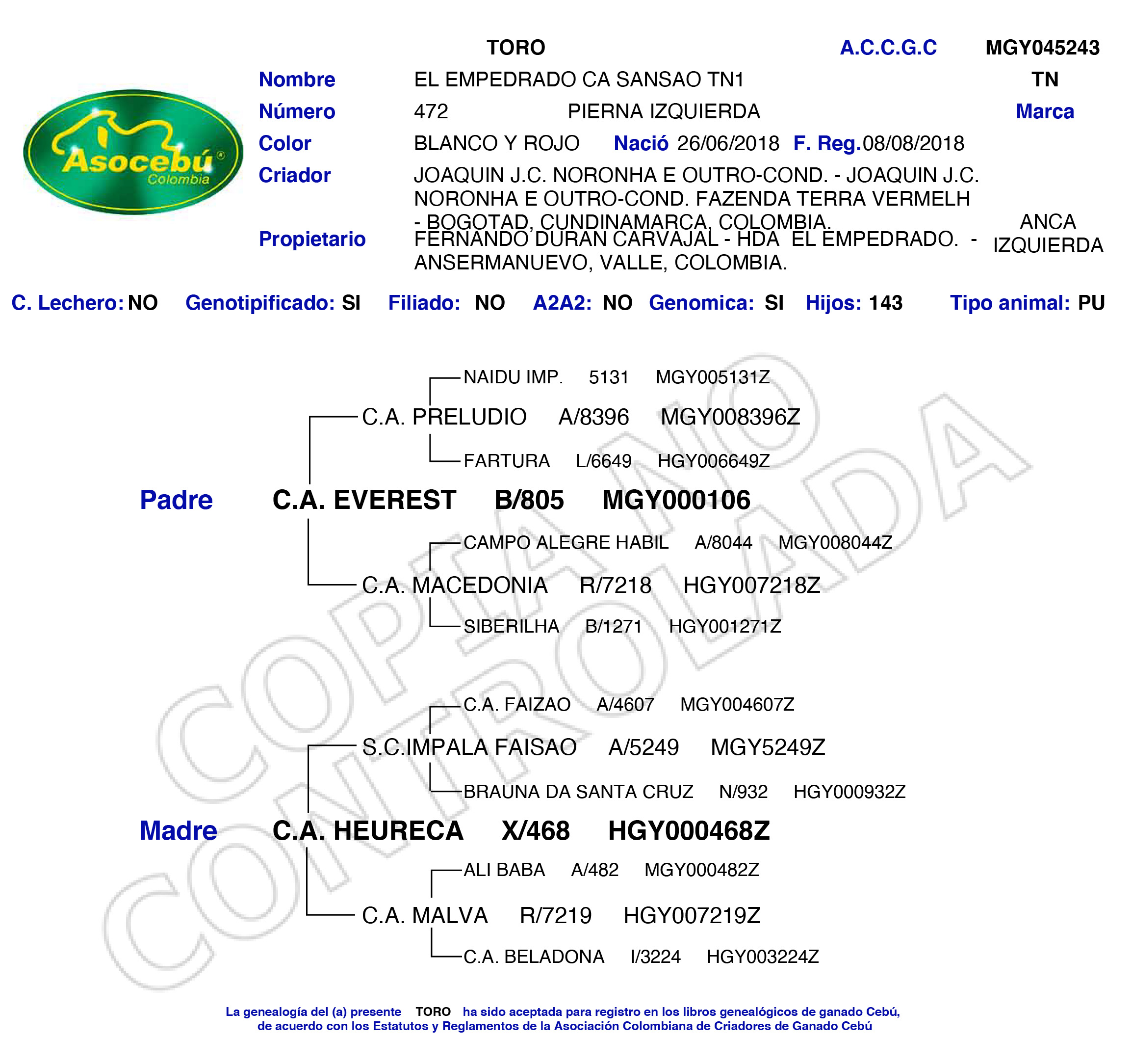 PADRE: C.A. EVEREST B/805 MADRE: C.A. HEURECA X/468 RAZA: GYR